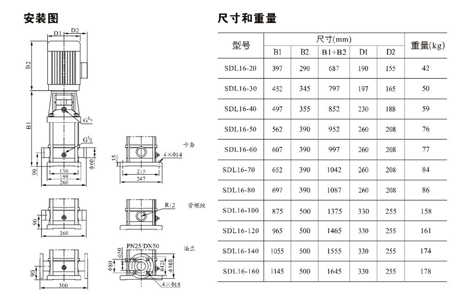 SDL16/SDLT16為配用標(biāo)準(zhǔn)電機的非自吸立式多級離心泵,電機軸和泵軸用聯(lián)軸器直接聯(lián)接,把拉桿用螺母將外筒,過流部件固定在支架和進(jìn)出水體之間,泵進(jìn)出水口在泵底部的同一直線上。泵可根據(jù)需要配置智能保護(hù)器,對泵的干轉(zhuǎn)、缺相、過載等進(jìn)行有效的保護(hù)。