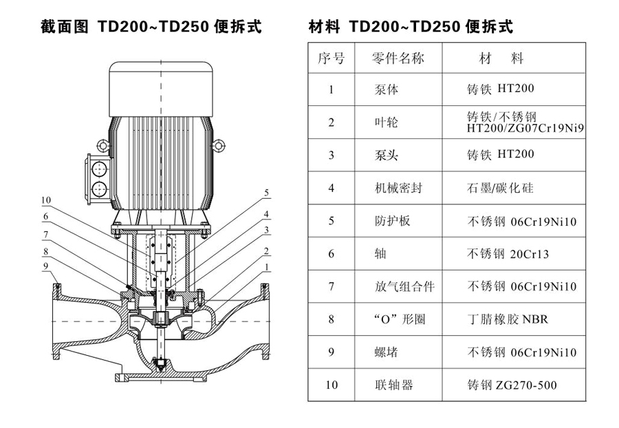 TD200系列單級管道離心泵,配有標準電機和機械密封。此類產(chǎn)品的結構與相近類型產(chǎn)品相比,更不易受到泵送液體中雜質(zhì)的影響。產(chǎn)品設計為頂部可拉出的拆裝形式,其可以在不影響管路系統(tǒng)的情況下對泵進行維修。所有泵采用創(chuàng)新式便拆式機械密封,更好機械密封無需拆卸電機。